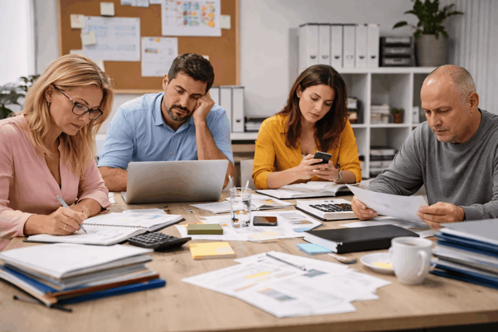 Au sein du CSE, Émilie, Thomas, Nadia et Laurent travaillent chacun de leur côté, avec peu de coordination.